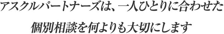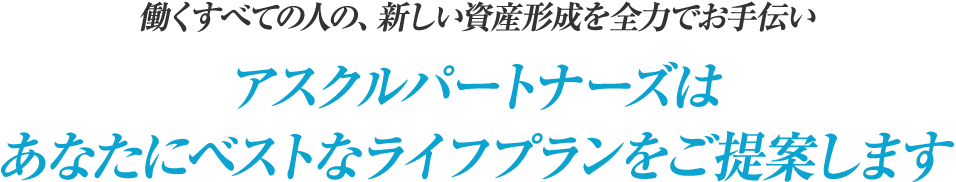 アスクルパートナーズは単に「マンション物件を販売」するのではなく「お客様のライフプランのご提案」にこそ、力を入れています。不動産投資を通じて、お客様がどのように生きていきたいか、どんな目標や希望、夢ががあるのかを一緒にプランニングできる存在でありたいからです。